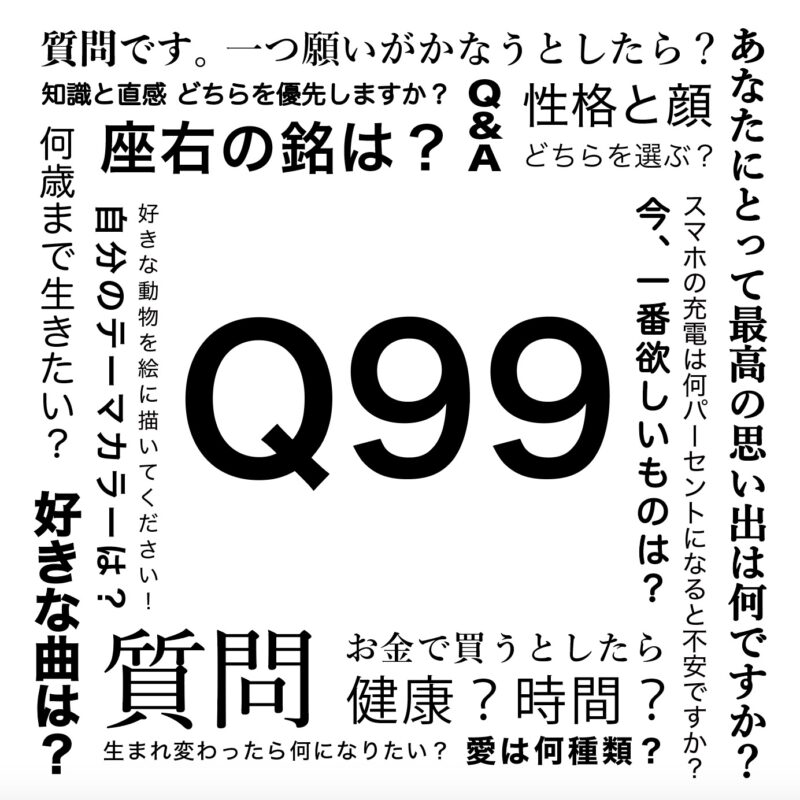 私たちインスティチュートは、普段あまり気にしないようなことや、ふと考えてもそのままにしてしまいそうな「99問の質問」を展示いたします。会場の沢山の質問に答えていきながら、自分の知らない自分を見つけたり、答えが増えれば増えるほど、他の人達のびっくりするような回答を目にするかもしれません。